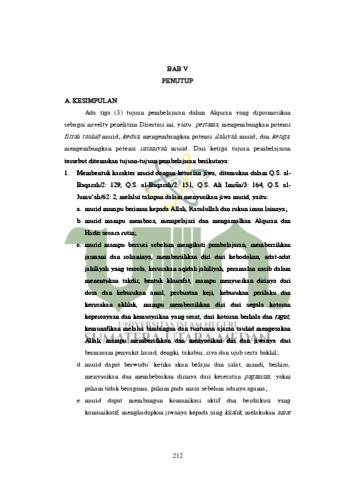 Fokus masalah penelitian ini adalah bagaimana tujuan pembelajaran dalam Alquran mampu mengembangkan potensi fitrah tauhid, potensi ilahiyah dan potensi insaniyah murid. Sedangkan tujuan penelitian adalah mengetahui tujuan pembelajaran dalam Alquran yang mampu mengembangkan potensi-potensi murid, yaitu: (1) potensi fitrah tauhid murid, (2) potensi ilahiyah murid, dan (3) potensi insaniyah murid. Penelitian ini menggunakan pendekatan kualitatif dengan metode tafsir mawdu>’iy, bertujuan untuk mengetahui isi Alquran yang mengandung tema-tema dan konsep-konsep tujuan pembelajaran. Adapun teknik pengumpulan data menggunakan dokumentasi, library research. Dokumen berupa teks-teks ayat Alquran yang diinventarisasi dan diterjemahkan serta ditafsirkan, dengan menggunakan kitab tafsir yang berbahasa Indonesia dan tafsir yang berbahasa Arab yang diterjemahkan ke dalam bahasa Indonesia, dengan dibantu buku terjemahan Alquran dan Tafsir yang sesuai. Sedangkan alat pengumpulan data dalam penelitian Disertasi ini adalah kitab yang berfungsi sebagai alat pencarian ayat-ayat Alquran, yaitu kitab al-Mu’jam al-Mufahras li al-Fa>z\ al- Qur’a>n al-Kari>m dan kitab Fath ar-rahma>n li T}a>lib Aya>t al-Qur’a>n. Hasil penelitian ini menujukkan bahwa ada tiga temuan tujuan pembelajaran dalam Alquran, yaitu: (a) Mengembangkan potensi fitrah tauhid murid, dalam Q.S. al- Baqarah/2: 129 dan 151, Q.S. Ali Imra>n/3: 164, Yu>suf/12: 37 dan 68, Q.S. an- Nah}l/16: 103, Q.S. al-Hujarat/49: 16, dan Q.S. al-Jumu’ah/62: 2; (b) Mengembangkan potensi ilahiyah murid, dalam Q.S. al-An’am/6: 91, Q.S. al- A’raf/7: 169, Q.S. al-Kahfi/18: 66, Q.S. Ya>si>n/36: 69, dan Q.S. al-‘Alaq/96: 5; dan (c) Mengembangkan potensi insaniyah murid, dalam Q.S. al-Baqarah/2: 31, 32, 102, 239, 251 dan 282, Q.S. Ali Imra>n/3: 48 dan 79, Q.S. an-Nisa>’/4: 113, Q.S. al-Maidah/5: 4 dan 110, Q.S. al-An’a>m/6: 105, Q.S. Yu>suf/12: 6, 21 dan 101, Q.S. al-Isra>’/17: 24, al-Kahfi/18: 65, Q.S. T{aha/20: 71, Q.S. al-Anbiya>’/21: 80, Q.S. asy-Syu’ara/26: 18 dan 49, Q.S. an-Naml/27: 16, Q.S. Saba>’/34: 44, Q.S. an-Najm/53: 5, Q.S. ar-Rahman/55: 2 dan 4, Q.S. al-Qalam/68: 37, dan Q.S. al- ‘Alaq/96: 4.