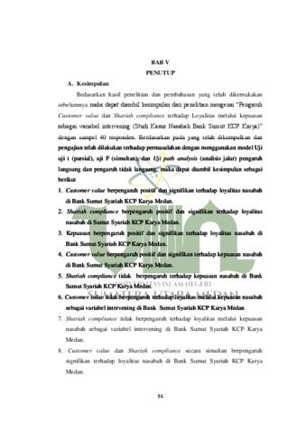 Penelitian ini bertujuan untuk mengetahui pengaruh customer value dan shariah compliance terhadap loyalitas nasabah melalui kepuasan sebagai variabel intervening pada nasabah di Bank Sumut Syariah KCP Karya Medan. Metode dalam penelitian ini menggunakan metode kuantitatif. Populasi dalam penelitian ini adalah nasabah funding di Bank Sumut Syariah KCP Karya Medan. Teknik pengambilan sampel yang digunakan adalah non probability sampling yaitu accidental sampling. Jumlah sampel yang ditemui adalah 40 responden. Data primer yang diperoleh dengan menyebarkan kuisioner secara langsung. Analisis data yang digunakan dalam penelitian ini adalah uji kualitas data, uji asumsi klasik, uji hipotesis, uji F (Simultan) dan uji analisis jalur (path analysis) dengan menggunakan SPSS versi 23.0. Hasil penelitian ini menunjukkan bahwa (i) customer value berpengaruh positif dan signifikan terhadap loyalitas nasabah (ii) shariah compliance berpengaruh positif dan signifikan terhadap loyalitas nasabah (iii) kepuasan berpengaruh positif dan signifikan terhadap loyalitas nasabah (iv) customer value berpengaruh positif dan signifikan terhadap kepuasan (v) shariah compliance tidak berpengaruh terhadap kepuasan (vi) customer value tidak berpengaruh terhadap loyalitas melalui kepuasan nasabah sebagai variabel intervening (vii) shariah compliance tidak berpengaruh terhadap loyalitas melalui kepuasan nasabah sebagai variabel intervening (viii) customer value dan shariah compliance secara simultan berpengaruh signifikan terhadap loyalitas nasabah.