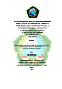 Penelitian ini bertujuan untuk mengetahui perbedaan antara kemampuan penalaran matematis siswa yang diajar dengan model pembelajaran kooperatif tipe Jigsaw dan model pembelajaran ROPES pada materi prisma, mengetahui perbedaan antara kemampuan pemahaman konsep matematis siswa yang diajar dengan model pembelajaran kooperatif tipe Jigsaw dan model pembelajaran ROPES pada materi prisma, dan mengetahui perbedaan antara kemampuan penalaran dan pemahaman konsep matematis siswa yang diajar dengan model pembelajaran kooperatif tipe Jigsaw dan model pembelajaran ROPES pada materi prisma. Penelitian ini adalah penelitian kuantitatif dengan jenis penelitian quasi eksperimen. Populasinya adalah seluruh siswa kelas VIII SMP IT Baiti Jannati tahun ajaran 2021- 2022 yang berjumlah 3 kelas. Sampel yang digunakan oleh peneliti adalah kelas VIII-1 dan VIII-2 yang masing-masing berjumlah 17 siswa diperoleh dengan cara cluster random sampling. Instrumen yang digunakan adalah tes berbentuk uraian. Analisis data dilakukan dengan analisis varians (ANAVA). Hasil temuan ini menunjukkan: 1) Terdapat perbedaan kemampuan penalaran matematis siswa yang diajar dengan model pembelajaran kooperatif tipe Jigsaw dan model pembelajaran ROPES pada materi prisma; 2) Terdapat perbedaan kemampuan pemahaman konsep matematis siswa yang diajar dengan model pembelajaran kooperatif tipe Jigsaw dan model pembelajaran ROPES pada materi prisma; 3) Terdapat perbedaan kemampuan penalaran dan pemahaman konsep matematis siswa yang diajar dengan model pembelajaran kooperatif tipe Jigsaw dan model pembelajaran ROPES pada materi prisma. Simpulan dalam penelitian ini menjelaskan bahwa terdapat perbedaan kemampuan penalaran dan pemahaman konsep matematis siswa yang diajar dengan model pembelajaran kooperatif tipe Jigsaw dan model pembelajaran ROPES.