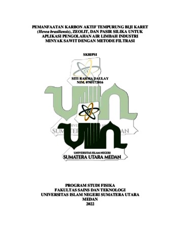 Daulay, Siti Rahma (2022) Pemanfaatan Karbon Aktif Tempurung Biji Karet (Hevea brasiliensis), Zeolit, dan Pasir Silika Untuk Aplikasi Pengolahan Air Limbah Industri Minyak Sawit Dengan Metode Filtrasi. Other thesis, Universitas Islam Negeri Sumatera Utara.