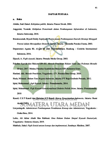 Hutagalung, Shintiya Novitasari (2022) Implementasi Kebijakan Pemerintah Tapteng dalam Pembangunan Infrastruktur Jalan Berdasarkan UU No 38 Tahun 2004 Ditinjau dari Fiqh Siyasah (Studi Kasus Kelurahan Sibuluan Terpadu Kecamatan Pandan Pandan Kabupaten Tapanuli Tengah). Skripsi thesis, Universitas Islam Negeri Sumatera Utara.