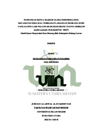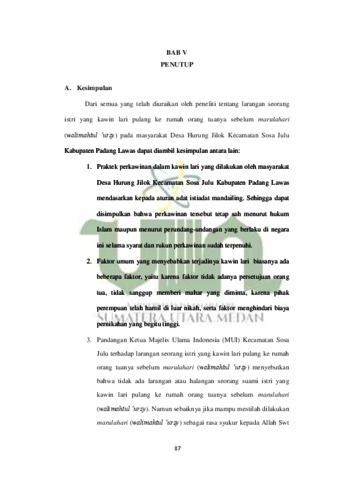 .“Pandangan Ketua Majelis Ulama Indonesia (MUI) Kecamatan Sosa Julu Terhadap Larangan Seorang Istri Yang Kawin Lari Pulang Ke Rumah Orang Tuanya Sebelum Marulahari (Walimahtul ‘Ursy) (Studi Kasus Masyarakat Desa Hurung Jilok Kabupaten Padang Lawas)”. SKRIPSI Jurusan Hukum Keluarga Islam Fakultas Syari’ah dan Hukum Universitas Islam Negeri Sumatera Utara Medan. Di desa Hurung Jilok terdapat permasalahan mengenai larangan seorang istri yang kawin lari pulang ke rumah orang tuanya sebelum Marulahari (Walimahtul ‘Ursy). Dimana pemuka adat desa Hurung Jilok menyebutkan bahwa :”Walaupun sudah dilaksanakannya akad pernikahan (Ijab dan Qobul) dalam perkawinan kawin lari, maka kedua dari mempelai tersebut dilarang berkunjung ke tempat kediaman perempuan tersebut Rumusan masalah dalam penelitian ini adalah (1) Bagaimana praktek kawin lari di desa Hurung Jilok Kecamatan Sosa Julu Kabupaten Padang Lawas? (2) Apa factor yang menyebabkan terjadinya praktek kawin lari di desa Hurung Jilok Kecamatan Sosa Julu Kabupaten Padang Lawas? (3) Bagaimana Pandangan Ketua Majelis Ulama Indonesia (MUI) Kecamatan Sosa Julu Kabupaten Padang Lawas tentang larangan seorang istri yang kawin lari pulang ke rumah orang tuanya sebelum Marulahari (Walimahtul ‘Ursy)? Metode penelitian yang digunakan adalah penelitian lapangan (Field Rresearch) di desa Hurung Jilok Kecamatan Sosa Julu Kabupaten Padang Lawas. Adapun jenis penelitian yang dilakukan penulis yaitu penelitian lapangan yang menggunakan metode kualitatif. Teknik pengumpulan data yang digunakan menggunakan observasi dan wawancara kemudian dilakukan penarikan kesimpulan. Dari penelitian ini dapat disimpulkan bahwa pandangan Ketua Majelis Ulama Indonesia (MUI) Kecamatan Sosa Julu Kabupaten Padang Lawas terhadap larangan seorang istri yang kawin lari pulang ke rumah orang tuanya sebelum Marulahari (Walimahtul ‘Ursy) menyebutkan bahwa tidak ada larangan atau halangan seorang istri yang kawin lari pulang ke rumah orang tuanya sebelum Marulahari (Walimahtul ‘Ursy). Namun sebaiknya jika mampu ada baiknya melakukan Marulahari (Walimahtul ‘Ursy) sebagai rasa syukur kepada Allah SWT untuk memberitahukan kepada seluruh masyarakat bahwa telah terjadinya akad pernikahan antara pria dan wanita.