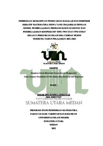 Ningtyas, Indah Dwi Puspita (2022) Perbedaan Kemampuan Pemecahan Masalah dan Berpikir Kreatif Matematika Siswa yang diajarkan dengan Model Pembelajaran Problem Based Learning dan Pembelajaran Kooperatif Tipe Two Stay-Two Stray Kelas X Perguruan Islam SMA Cerdas Murni Tembung Tahun Pelajaran 2021-2022. Skripsi thesis, Universitas Islam Negeri Sumatera Utara.