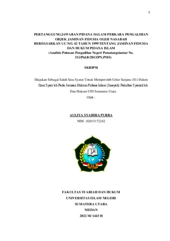 Purba, Auliya Syahira (2022) Pertanggungjawaban pidana dalam perkara Pengalihan Objek Jaminan Fidusia oleh Nasabah Berdasarkan UU No. 42 Tahun 1999 Tentang Jaminan Fidusia dan Hukum Pidana Islam (Analisis Putusan Pengadilan Negeri Pematangsiantar No. 311/Pid.B/2013/PN.PMS). Skripsi thesis, Universitas Islam Negeri Sumatera Utara.