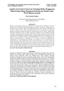 Pembiayaan modal usaha berperan penting dalam meningkatkan perekonomian masyarakat. Pembiayaan disediakan oleh lembaga keuangan guna mempermudah pengusaha atau pebisnis untuk memperoleh modal dan tambahan dana untuk usahanya. Penyedia pembiayaan diharapkan mampu memfasilitasi pelaku-pelaku usaha untuk meningkatkan kualitas dan kuantitas produk usaha melalui pemberdayaan dana modal usaha ini. Lembaga pembiayaan terdiri dari lembaga pembiayaan syariah dan lembaga pembiayaan non syariah. Lembaga pembiayaan syariah menerapkan prinsip-prinsip syariah dan ketentuan hukum berdasarkan al-Qur’an dan hadis, berada dibawah naungan Otoritas Jasa Keuangan dan diawasi oleh Dewan Syariah Nasional (DSN-MUI). Pada hakikatnya pengajuan pembiayaan modal usaha diajukan oleh nasabah yang bersangkutan. Dengan memenuhi persyaratan- persyaratan yang ditetapkan oleh lembaga pembiayaan, maka setiap pelaku usaha dapat memperoleh pembiayaan modal usaha. Permasalahan yang terjadi ialah pihak ketiga hadir di luar perjanjian pembiayaan. Penggunaan pihak ketiga tanpa sepengetahuan pihak pertama pada pengajuan pembiayaan modal usaha ini berpotensi menimbulkan sejumlah risiko. Untuk itu penulis merasa perlu dilakukannya penelitian mengenai permasalahan ini berdasarkan pada teori Sadd al-dzari’ah, guna memperoleh titik terang dan kepastisan hukum dari permasalahan yang terjadi.