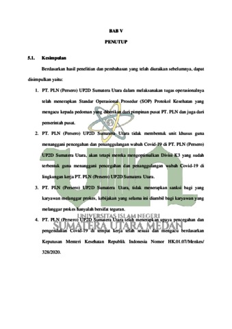 Suaibah, Suaibah (2022) Kajian Penerapan Protokol Kesehatan Berdasarkan Keputusan Menteri Kesehatan Nomor HK.01.07/MENKES/328/2020 Di PT. PLN (Persero) UP2D Sumut. Skripsi thesis, Universitas Islam Negeri Sumatera Utara.