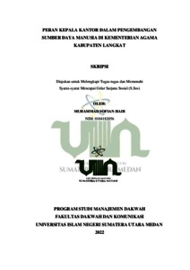 Secara umum penelitian skripsi ini bertujuan mengetahui peran kepala kantor dalam pengembangan sumber daya manusia di Kementerian Agama Kabupaten Langkat, untuk mengetahui upaya kepala kantor dalam pengembangan sumber daya manusia di Kementerian Agama Kabupaten Langkat dan untuk mengetahui apa saja yang dilakukan kepala kantor dalam pengembangan sumber daya manusia di Kementerian Agama Kabupaten Langkat. Pendekatan penelitian yang digunakan dalam penelitian ini adalah pendekatan kualitatif, yang mana data- datanya dikumpulkan melalui metode: wawancara, observasi, serta dokumentasi. Teknik analisis datanya dengan tiga jalur yakni dengan penyajian data, reduksi data, serta penarikan kesimpulan. Hasil penelitian ini menunjukkan bahwasanya peran Kepala Kantor dalam pengembangan sumber daya manusia di Kementerian Agama Kabupaten Langkat berjalan dengan cukup baik dalam pelaksanaannya. Hal itu dapat dilihat dari peran kepala kantor itu sendiri yaitu sebagai fasilitator, sebagai motivator, sebagai mediator, sebagai pembuat keputusan dan juga sebagai sumber informasi. Upaya Kepala Kantor dalam pengembangan sumber daya manusia di Kementerian Agama Kabupaten Langkat yakni melakukan perencanaan sumber daya manusia yang baik yang mencakup pengadaan rekrutmen dan seleksi serta mengadakan pelatihan dan pengembangan sumber daya manusia. Adapun kendala yang terjadi yaitu kurangnya motivasi dari ASN itu sendiri; tingginya kebutuhan ekonomi yang tidak sesuai dengan gaji dan tunjangan; para pegawai masuk kurang disiplin, sedikit-sedikit terlambat, tidak tepat waktu dengan segala macam alasan; dan masih kurangnya IT. Dan untuk solusinya yaitu memberikan motivasi dalam bentuk ASN; melakukan sosialisasi dan teknis tentang gaji dan tunjangan; akan lebih ditingkatkan lagi nilai kedisiplinan dalam bekerja terutama dalam hal menghargai waktu; mengadakan pelatihan dan juga pengembangan terkhusus bagi para seluruh pegawai yang berada di Kementerian Agama Kabupaten Langkat tentang IT Agar para pegawai dibidang IT lebih mendalami lagi tentang ilmunya dan juga untuk para pegawai yang berada dilain bidang juga akan faham mengenai ilmu IT sehingga mereka dapat turut membantu pegawai dibidang IT.