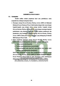Penelitian yang telah dilakukan berjudul “Implementasi Strategi Directed Reading Thinking Activity Pada Pembelajaran Bahasa Indonesia Di MIS Parmiyatu Wassa‟Adah”, yang dilator belakangi bahwa strategi DRTA terhadap pembelajaran Bahasa Indonesia sangat diperlukan. Dalam proses pembelajaran Bahasa Indonesia memerlukan strategi DRTA agar siswa lebih mudah memahami materi yang diberikan. Metodologi penelitian ini menggunakan pendekatan deskriptif kualitatif. Populasi penelitian ini adalah siswa MIS Parmiyatu Wassa‟Adah dengan jumlah sampel 35 siswa. Teknik pengambilan sampel didasarkan pada kriteria yang di tetapkan oleh peneliti. Teknik pengumpulan data dengan observasi, wawancara, dokumentasi dan evaluasi. Hasil penelitian mengungkapkan bahwa strategi DRTA dalam pembelajaran Bahasa Indonesia sangat diperlukan dalam menunjang pemahaman siswa terhadap materi yang dijelaskan. Strategi DRTA juga sangat mudah di pahami siswa dan menyukai strategi tersebut. Berdasarkan pada temuan penelitian diatas maka penerapan strategi DRTA sangat berperan penting dalam pembelajaran Bahasa Indonesia dalam meningkatkan pemahaman siswa.