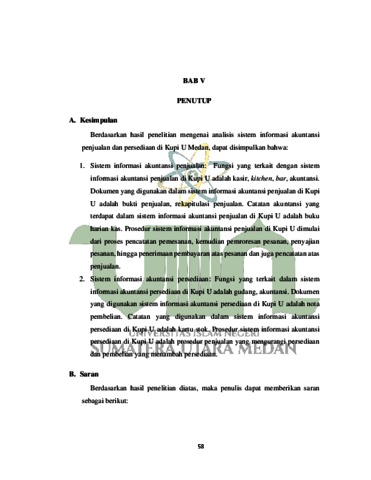 Sistem informasi akuntansi merupakan sistem yang dapat membantu manajemen perusahaan untuk mengambil suatu keputusan yang memberikan pengaruh pada perusahaan sehingga perusahaan mampu menghadapi tantangan dari perusahaan- perusahaan yang sejenis. Tujuan dari penelitian ini adalah untuk mengetahui sistem informasi akuntansi penjualan dan persediaan yang selama ini digunakan Kupi U Medan. Analisis data yang digunakan dalam penelitian ini adalah Analisis Deskriptif Kualitatif dimana tujuannya adalah mengambarkan secara sistematis tentang fokus penelitian yang meliputi sistem informasi akuntansi penjualan dan persediaan. Data dikumpulkan dengan cara wawancara, observasi, dan dokumentasi. Hasil penelitian menunjukkan bahwa sistem informasi akuntansi penjualan dan persediaan yang dimiliki oleh Kupi U Medan sudah menggunakan sistem online. Fungsi yang terkait dalam sistem informasi akuntansi penjualan adalah kasir, kitchen, bar, akuntansi, sedangkan untuk persediaan adalah gudang, akuntansi. Dokumen yang digunakan dalam sistem informasi akuntansi penjualan adalah bukti penjualan, rekapitulasi penjualan, sedangkan persediaan adalah nota pembelian. Catatan akuntansi yang terdapat dalam sistem informasi akuntansi penjualan adalah buku harian kas, sedangkan persediaan adalah kartu stok. Prosedur sistem informasu akuntansi penjualan dimulai dari proses pencatatan pemesanan, kemudian pemroresan pesanan, penyajian pesanan, hingga penerimaan pembayaran atas pesanan dan juga pencatatan atas penjualan, sedangkan persediaan adalah prosedur penjualan yang mengurangi persediaan dan pembelian yang menambah persediaan.