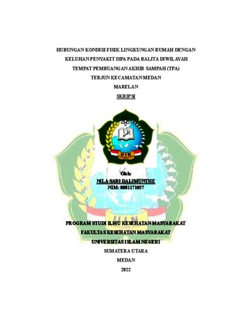Dalimunthe, Nila Sari (2022) Hubungan kondisi fisik lingkungan rumah dengan keluhan penyakit ISPA pada Balita diwilayah Tempat pembuangan akhir sampah (TPA) Terjun Kecamatan Medan Marelan. Skripsi thesis, Universitas Islam Negeri Sumatera Utara.