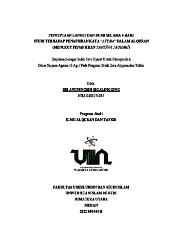 Sigalingging, Sri Ayuningsih (2022) Penciptaan Langit dan bumi Selama 6 Hari Studi Terhadap Penafsiran Kata “Ayyam” dalam Alquran (Menurut Penafsiran Ṭanṭāwi Jauharī). Skripsi thesis, Universitas Islam Negeri Sumatera Utara.