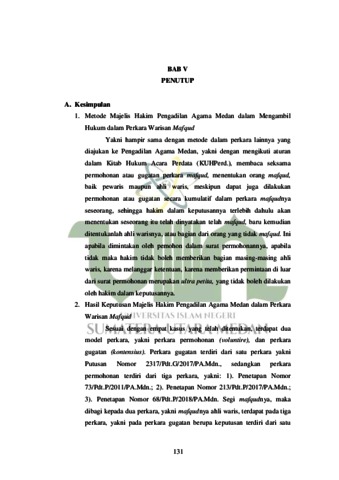 Perkara mafqud yang diajukan ke Pengadilan Agama Medan relatif sedikit, baik mafqud pewaris maupun mafqudnya ahli waris, majelis hakim mempunyai penilaian sendiri dalam putusannya. Metode penelitian tesis terdiri dari beberapa bagian, jenis penelitian yuridis-normatif empiris, dengan pendekatan kasus (case approach) dan pendekatan teks hukum (statuta approach), pendekatan keputusan Pengadilan Agama Medan, teknik pengumpulan data, observasi, wawancara, dan dokumentasi Hasil penelitian: Metode majelis hakim Pengadilan Agama Medan dalam mengambil hukum perkara warisan mafqud, sama dengan metode dalam perkara lainnya yang diajukan ke Pengadilan Agama Medan, dengan mengikuti aturan hukum formil dan hukum materiil. Hasil keputusan majelis hakim Pengadilan Agama Medan dalam perkara warisan mafqud, dalam empat kasus, terdapat tiga permohonan yang dikabulkan, yakni Penetapan Nomor 73/Pdt.P/2011/PA.Mdn.; Penetapan Nomor 213/Pdt.P/2017/PA.Mdn.; dan Penetapan Nomor 68/Pdt.P/2018/PA.Mdn., perkara tidak diterima Putusan Nomor 2317/Pdt.G/2017/PA.Mdn. Keputusan majelis hakim Pengadilan Agama Medan dalam mengambil hukum dalam perkara warisan mafqud telah sesuai dengan prinsip-prinsip keadilan serta norma-norma hukum, secara umum telah memenuhi prinsip keadilan, tapi di lain pihak terdapat keputusan majelis yang tidak sesuai dengan asas equality before the law (persamaan di depan hukum). Standarisasi dari pernyataan tentang mafqud nya seseorang berbeda-beda, terdapat pengabaian hak-hak ahli waris dari saudara kandung.