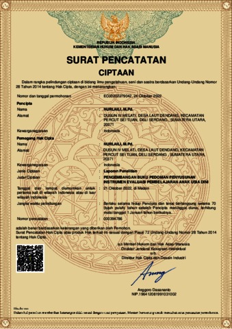 Nurlaili, Nurlaili (2022) HAKI Pengembangan Buku Pedoman Penyusunan Instrumen Evaluasi Pembelajaran Anak Usia Dini. Universitas Islam Negeri Sumatera Utara.