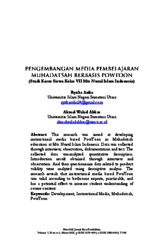 This research was aimed at developing instructional media based PowToon in Muhadatsah education at Mts Nurul Islam Indonesia. Data was collected through interview, observation, dokumentation and test. The collected data wasanalyzed quantitative description. Introduction result obtained through interview and observation. And then questionnaire data related to product validity were analyzed using descriptive analysis. The research reveals that instructional media based PowToon was valid according to bothsome experts, practicable, and has a potential effect to increase student understanding of course content.