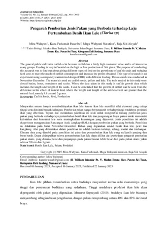Wahyuni, Mira (2023) Pengaruh Pemberian Jenis Pakan yang Berbeda terhadap Laju Pertumbuhan Benih Ikan Lele (Clarisa sp). Journal on Education, 5 (2). pp. 3944-3949. ISSN 2654-5497