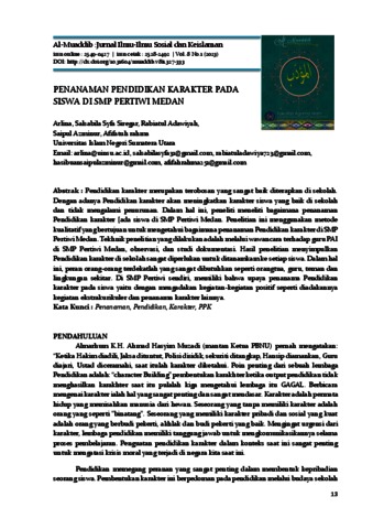 Arlina, Arlina and Siregar, Salsabila Syfa and Adawiyah, Rabiatul and Azminur, Saipul and Rahma, Afifatuh (2023) Penanaman Pendidikan Karakter Pada Siswa Di SMP Pertiwi Medan. Al-Muaddib :Jurnal Ilmu-Ilmu Sosial dan Keislaman, 8 (1). pp. 327-333. ISSN 2549-0427