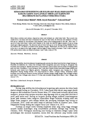 Silalahi, Fachrul Azhari and Hutasuhut, Melfa Aisyah and Idami, Zahratul (2023) Keragaman jenis burung di Air Kawasan Suaka Margasatwa Karang Gading dan Langkat Timur Kabupaten Deli Serdang dan Langkat Sumatera Utara. Eksakta : Jurnal Penelitian dan Pembelajaran MIPA, 8 (1). ISSN p-ISSN: 2502-101X e-ISSN: 2598-2400