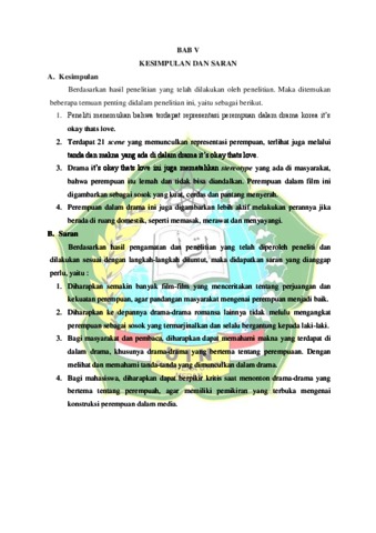 Tujuan dari penelitian ini yaitu untuk mengetahui bagaimanakah representasi perempuan dalam drama korea it’s okay thats lovedan menemukan makna dan tanda yang digunakan untuk memecahkan penelitian ini adalah teori semiotika. Objek penelitiannya yaitu drama korea it’s okay thats love, yang merupakan drama produksi korea selatan dan tayang pada tahun 2014 yang terdiri 16 episode dengan durasi 59-60 menit. Metode yang digunakan dalam penelitian ini yaitu metode kualitatif dengan teknik analisis semiotika model Roland Barthes. Hasil penelitian menunjukan bahwa terdapat beberapa adegan yang menggambarkan representasi perempuan di dalam drama korea it’s okay thats love. Representasi perempuan tersebut terlihat dari tanda dan makna yang di telaah melalui teori semiotika Roland Barthes.