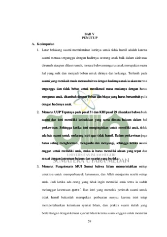 Dalam perkawinan tentu anak adalah suatu anugerah terindah yang sangat diharapkan dan dinantikan oleh banyak orang, namun dalam praktiknya sebagaimana yang terjadi di Desa Sibargot Kecamatan Bilah Barat Kabupaten Labuhanbatu, terdapat beberapa pasangan yang suaminya melarang istrinya untuk hamil dan memiliki anak. Secara sepintas hal ini tentu tidak adil terhadap istri, karena tentu istri memiliki keinginan untuk memiliki anak. Namun, karena di masyarakat paham istri harus menuruti perintah suami banyak yang menganggap bahwa istri itu telah durhaka dan tidak mematuhi perintah suaminya. Maka dari itu penulis tertarik untuk meneliti ini lebih lanjut dengan rumusan masalah berikut, apa yang melatarbelakangi perintah suami kepada istri untuk tidak hamil, bagaimana pandangan undang-undang perkawinan dan kompilasi hukum islam tentang perintah suami kepada istri untuk tidak hamil, bagaimana pandangan mui sumut terhadap perintah suami kepada istri untuk tidak hamil dalam perspektif nusyuz Penelitian ini termasuk penelitian kualitatif dengan menggunakan metode penelitian yuridis empiris yang menggunakan dua sumber data yaitu primer dan sekunder. Teknik pengumpulan data pada penelitian ini menggunakan teknik library research, yang mana berarti penelitian yang menggunakan buku atau aturan tertentu sebagai bahan literatur dan field research atau penelitian lapangan yaitu dengan cara pengumpulan dokumentasi dan wawancara. Serta metode analisis data yang digunakan dalam penelitian ini adalah analisis kualitatif yang disajikan dalam bentuk deksriptip. Hasil dari Penelitian ini ditemukan bahwa yang melatar belakangi perintah suami agar istri tidak hamil adalah karena suami merasa belum siap dan menjadikan anak sebagai beban yang membuat ia tidak bebas untuk melakukan aktivitas sehari-hari nantinya, kemudian menurut UUP dan KHI bahwa dalam perkawinan suami dan istri memiliki hak dan kedudukan yang sama sehingga suami tidak bisa memerintahkan istri untuk tidak hamil secara sepihak, selain itu menurut pandangan fungsionaris MUI Sumut bahwa suami tidak dibenarkan untuk melarang istri agar tidak hamil karena Islam saja memerintahkan umatnya untuk memperbanyak keturunan dan Allah sudah menjamin setiap rezeki anak, suami boleh melarang istri hamil kalau membawanya pada hal yang mudharat, sehingga ketika istri menolak perintah itu ia tidak dianggap berbuat nusyuz.