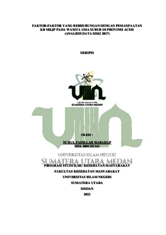Harahap, Nurul Fadillah (2022) Faktor-faktor yang Berhubungan dengan Pemanfaatan KB MKJP Pada Wanita Usia Subur di Provinsi Aceh (Analisis Data SDKI 2017). Skripsi thesis, Universitas Islam Negeri Sumatera Utara.