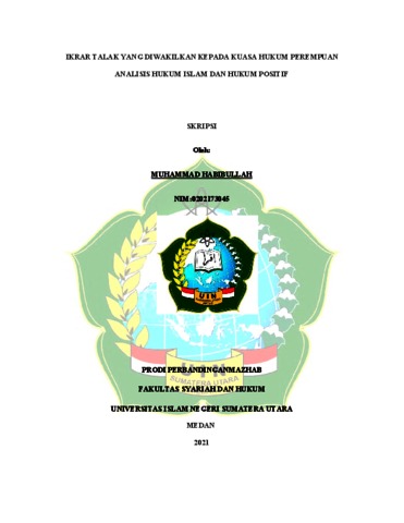 Habibullah, Muhammad (2021) Ikrar Talak Yang Diwakilkan kepada Kuasa Hukum Perempuan Analisis Hukum Islam dan Hukum positif. Skripsi thesis, Universitas Islam Negeri Sumatera Utara.