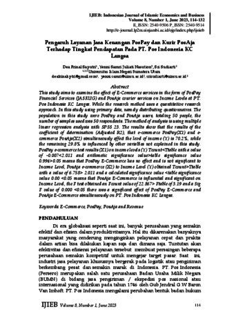 This study aims to examine the effect of E-Commerce services in the form of PosPay Financial Services (JASKUG) and PosAja courier services on Income Levels at PT. Pos Indonesia KC Langsa. While the research method uses a quantitative research approach. In this study using primary data, namely distributing questionnaires. The population in this study were PosPay and PosAja users, totaling 50 people, the number of samples used was 50 respondents. The method of analysis is using multiple linear regression analysis with SPSS 23. The results show that the results of the coefficient of determination (Adjusted R2), that e-commerce PosPay(X1) and ecommerce PosAja(X2) simultaneously affect the level of income (Y) is 70.2%, while the remaining 29.8% is influenced by other variables not explained in this study. PosPay e-commerce test results (X1) on income levels (Y) Tcount<Ttable with a value of -0.007<2.011 and arithmetic significance value>table significance value 0.994>0.05 means that PosPay E-Commerce has no effect and is not significant to Income Level, PosAja e-commerce (X2) to Income Level (Y) obtained Tcount>Ttable with a value of 6.758> 2.011 and a calculated significance value <table significance value 0.00 <0.05 means that PosAja E-Commerce is influential and significant on Income Level, the F test obtained an Fcount value of 22.867> Ftable of 3.19 and a Sig F value of 0.000 <0.05 there was a significant effect of PosPay E-Commerce and PosAja E-Commerce simultaneously on PT. Pos Indonesia KC Langsa.