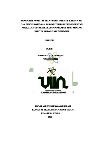 Tanjung, Ahmad Fuadi (2022) Pengaruh Kualitas pelayanan, Insentif karyawan, Dan Pengelompokan barang Terhadap Peningkatan Penjualan UD. Rezeki Baru Cap Rumah Adat Minang Di Kota Medan Tahun 2017-2021. Skripsi thesis, Universitas Islam Negeri Sumatera Utara.