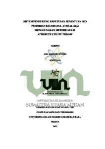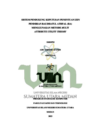 Afandi, Ade Aminah (2023) Sistem Pendukung Keputusan Penentuan Izin Pendirian Raudhatul Athfal (RA) Menggunakan Metode Multi Attribute Utility Theory. Skripsi thesis, Universitas Islam Negeri Sumatera Utara.