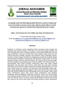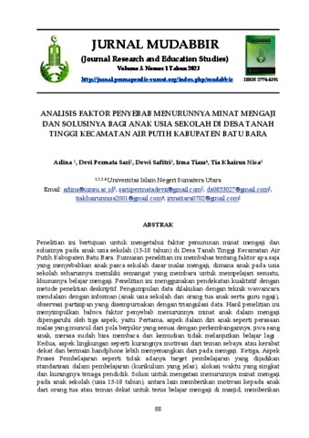 Arlina, Arlina and Sari, Devi Permata and Safitri, Dewi and Tiara, Irma and Nisa, Tia Khairun (2023) Analisis Faktor Penyebab Menurunnya Minat Mengaji Dan Solusinya Bagi Anak Usia Sekolah Di Desa Tanah Tinggi Kecamatan Air Putih Kabupaten Batu Bara. Jurnal Mudabbir: Journal Research and Education Studies, 3 (1). ISSN 2774-8391