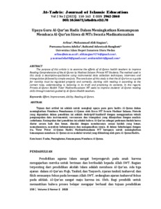 The purpose of this article is to examine the efforts of Al-Quran hadith teachers to improve Reading Comprehension of the Al-Quran by Madinat Salaam Private MT Students. The method used in this study is descriptive-qualitative using instrumental data collection techniques, interviews and triangulation followed by simple analysis. The conclusion of this study is that the Al-Qur'an as a guide for worship must be regulated properly and correctly, starting with reading it according to the correct rules, understanding it, believing in its truth and practicing its contents. In this regard, Private Al-Quran Hadith Tutor Madinathusalaam MT seeks to improve students' Al-Quran reading skills through tutorials guided by Al-Quran Hadith teachers.