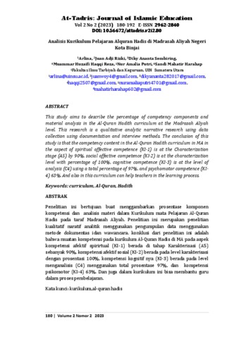 Arlina, Arlina and Rizki, Juan Adji and Sembiring, Diky Ananta and Reza, Muammar Huzaifi Haqqi and Putri, Nur Amalia and Harahap, Sandi Mahatir (2023) Analisis Kurikulum Pelajaran Al Quran Hadis Di Madrasah Aliyah Negeri Kota Binjai. At-Tadris: Journal of Islamic Education, 2 (2). pp. 180-192. ISSN 2962-2840