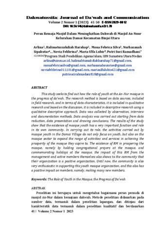 Arlina, Arlina and Harahap, Halimatussakdiah and Silva, Mona Febrica and Sipahutar, Nurhasanah and Fehbrina, Novia and Lubis, Maria Ulfa and Ramadhani, Putri Suci (2023) Peran Remaja Masjid Dalam Meningkatkan Dakwah Di Masjid An-Nuur Kelurahan Damai Kecamatan Binjai Utara. Dakwatussifa: Journal of Da’wah and Communication, 2 (1). pp. 41-50. ISSN 2829-8012