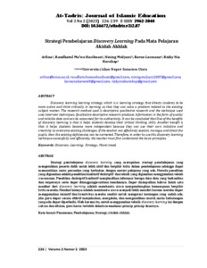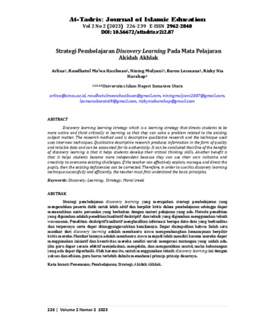 Arlina, Arlina and Hasibuan, Raudhatul Ma’wa and Mulyani, Nining and Lesmana, Baron and Harahap, Rizky Nia (2023) Strategi Pembelajaran Discovery Learning Pada Mata Pelajaran Akidah Akhlak. At-Tadris: Journal of Islamic Education, 2 (2). pp. 226-239. ISSN 2962-2840
