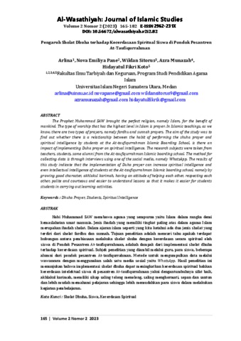 Arlina, Arlina and Pane, Nova Emiliya and Sitorus, Wildan and Munazah, Azra and Koto, Hidayatul Fikri (2023) Pengaruh Sholat Dhuha Terhadap Kecerdasaan Spiritual Siswa Di Pondok Pesantren At-Taufiqurrahman. Al-Wasathiyah: Journal of Islamic Studies, 2 (2). pp. 165-182. ISSN 2962-231X