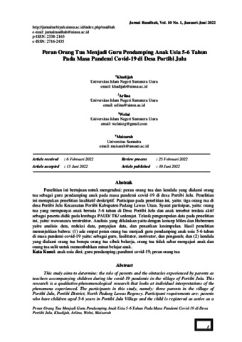 Khadijah, Khadijah and Arlina, Arlina and Welni, 3Welni and Maisarah, 4Maisarah (2022) Peran Orang Tua Menjadi Guru Pendamping Anak Usia 5-6 Tahun Pada Masa Pandemi Covid-19 Di Desa Portibi Julu. Jurnal Raudhah, 10 (1). ISSN 2716-2435
