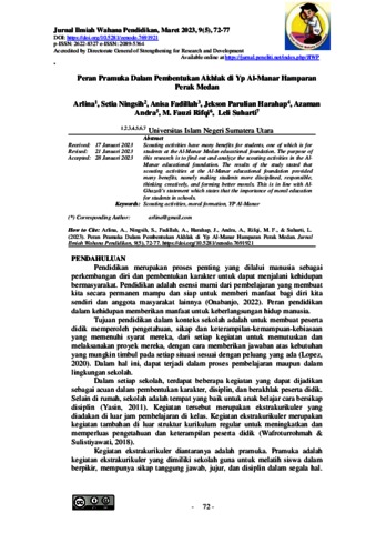 Arlina, Arlina and Ningsih, Setia and Fadillah, Anisa and Harahap, Jekson Parulian and Andra, Azaman and Rifqi, M. Fauzi and Suharti, Leli (2023) Peran Pramuka Dalam Pembentukan Akhlak Di YP Al-Manar Hamparan Perak Medan. Jurnal Ilmiah Wahana Pendidikan, 9 (5). pp. 72-77. ISSN 2089-5364