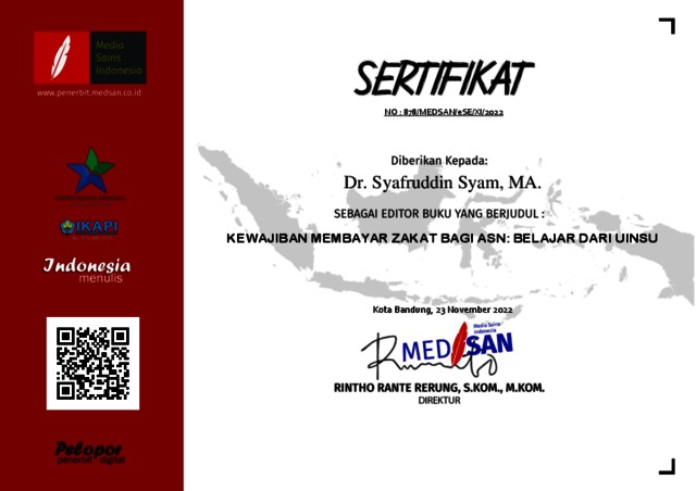 Syam, Syafruddin Sertifikat Editor Buku: KEWAJIBAN MEMBAYAR ZAKAT BAGI ASN: BELAJAR DARI UINSU. UIN Sumatera Utara Medan, Indonesia. (Submitted)