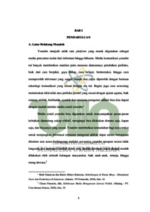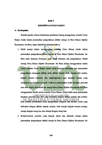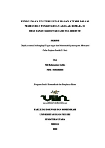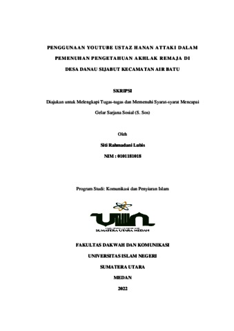 Penelitian ini bertujuan untuk mengetahui penggunaan youtube Ustaz Hanan Attaki dalam pemenuhan pengetahuan akhlak remaja di Desa Danau Sijabut Kecamatan Air Batu dan untuk mengetahui motif remaja menggunakan youtube Ustaz Hanan Attaki, konten youtube yang banyak dicari dan diminati remaja serta implikasi yang dialami remaja setelah menggunakan media youtube Ustaz Hanan Attaki. Jenis penelitian ini adalah penelitian lapangan (field research) dengan menggunakan metode pendekatan kualitatif deskriptif dan menggunakan metode pendekatan keilmuan yaitu ilmu komunikasi. Teknik yang digunakan dalam mengumpulkan data pada penelitian ini, menggunakan teknik wawancara tidak terstruktur. Hasil penelitian ini dapat ditarik kesimpulan bahwa penggunaan youtube Ustaz Hanan Attaki dalam pemenuhan pengetahuan akhlak remaja di Desa Danau Sijabut Kecamatan Air Batu pada dasarnya bermuara pada motif pemenuhan informasi dan pengetahuan tentang akhlak yang baik, dari sebelumnya tidak memahami menjadi memahami dari adanya pengetahuan akhlak yang disampaikan di media youtube, pemenuhan motif personal (diri), dan pemenuhan motif integritas dan interaksi sosial. Konten yang banyak dicari dan diminati remaja adalah konten-konten seputar akhlak, baik konten akhlak berisi pesan akhlak kepada diri sendiri, kepada orang tua, kepada orang lain, dan kepada lingkungan lainnya. Kemudian dari adanya pesan-pesan akhlak Ustaz Hanan Attaki ini berimplikasi terhadap pemenuhan pengetahuan atau kognitif remaja yang awalnya tidak tahu cara berakhlak yang baik sekarang menjadi tahu cara berakhlak yang baik. Implikasi youtube Ustaz Hanan Attaki dalam pemenuhan akhlak berhubungan dengan teori uses and affect dapat dilihat dari kebiasaan orang yang menonton yang menimbulkan sebuah effect dari apa yang dilihat, dan didengar oleh pengguna youtube.