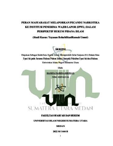 Ridwan, Hanifa Fajrina (2022) Peran Masyarakat Melaporkan Pecandu Narkotika Ke Institusi Penerima Wajib Lapor (IPWL) Dalam Perspektif Hukum Pidana Islam (Studi Kasus: Yayasan Rehabilitasi Narkotika). Skripsi thesis, Universitas Islam Negeri Sumatera Utara.