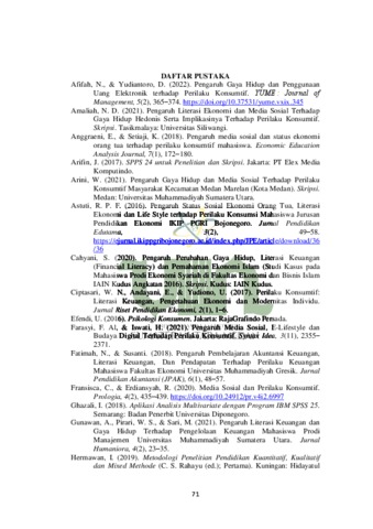 Penelitian ini bertujuan untuk mengetahui pengaruh media sosial, gaya hidup dan literasi keuangan terhadap perilaku konsumtif pada Mahasiswa FEBI UINSU baik itu secara parsial maupun secara simultan. Penelitian ini menggunakan metode kuantitatif. Populasi dalam penelitian ini adalah Mahasiswa FEBI UINSU angkatan 2018. Teknik pengambilan sampel yang digunakan adalah purposive sampling dengan jumlah sampel sebanyak 92 responden. Teknik pengumpulan data dengan menggunakan kuesioner. Data primer yang diperoleh dianalisis melalui program IBM SPSS statistic 25. Hasil penelitian menunjukkan bahwa pertama, media sosial berpengaruh positif dan signifikan terhadap perilaku konsumtif pada mahasiswa FEBI UIN-SU dengan nilai signifikan 0,005 ˂ 0,05. Kedua, gaya hidup berpengaruh positif dan signifikan terhadap perilaku konsumtif pada mahasiswa FEBI UIN-SU dengan nilai signifikan 0,000 ˂ 0,05. Ketiga, literasi keuangan berpengaruh positif dan signifikan terhadap perilaku konsumtif pada mahasiswa FEBI UIN-SU dengan nilai signifikan 0,001 ˂ 0,05. Keempat, secara simultan media sosial, gaya hidup dan literasi keuangan berpengaruh signifikan terhadap perilaku konsumtif dengan nilai signifikan < 0,05 yaitu 0,040 < 0,05.