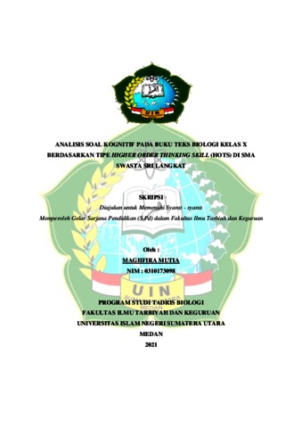 Mutia, Maghfira (2021) Analisis Soal Kognitif Pada Buku Teks Biologi Kelas X Berdasarkan Tipe Higher Order Thinking Skill (HOTS) di SMA Swasta Sri Langkat. Skripsi thesis, Universitas Islam Negeri Sumatera Utara.