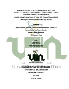 Rifai, Arif (2020) Kinerja Pegawai Dinas Kependudukan dan Pencatatan Sipil dalam Pelayanan Kartu Tanda Penduduk Elektronik (KTP-el) (Analisis Undang-Undang Nomor 25 Tahun 2009 Tentang Pelayanan Publik di Kabupaten Simalungun ditinjau dari Fiqh Siyasah). Skripsi thesis, Universitas Islam Negeri Sumatera Utara.