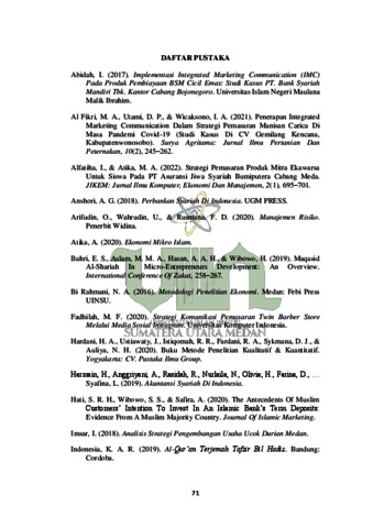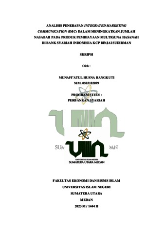Rangkuti, Munafi’atul Husna (2023) Analisis Penerapan Integrated Marketing Communication (IMC) Dalam Meningkatkan Jumlah Nasabah Pada Produk Pembiayaan Multiguna Hasanah Di Bank Syariah Indonesia KCP Binjai Sudirman. Skripsi thesis, Universitas Islam Negeri Sumatera Utara.