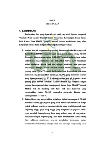 Penelitian ini bertujuan untuk mengetahui Peran Auditor Internal Dalam Mendeteksi Kecurangan Pada PDAM Tirtanadi. Metode pengumpulan data yang digunakan dalam penelitian ini adalah wawancara, kuesioner dan dokumentasi. Teknik analisis data yang digunakan dalam penelitian ini adalah teknik analisis deskriptif kualitatif. Berdasarkan hasil perhitungan, hasil persentase kuesioner untuk peran auditor internal adalah sebesar 72.39% yang memenuhi kriteria antara 51 – 75%, persentase tersebut menunjukan bahwa auditor internal berperan cukup penting di PDAM Tirtanadi. Sedangkan hasil persentase kuesioner untuk pendeteksian kecurangan (fraud) diperoleh hasil sebesar 79.16% yang memenuhi kriteria anatra 76 – 100%, persentase tersebut menunujukan bahwa auditor internal berperan sangat penting dalam mendeteksi kecurangan yang terjadi di PDAM Tirtanadi. Adapun faktor-faktor yang menyebabkan terjadinya tindak kecurangan di PDAM Tirtanadi adalah tekanan yang dialami oleh pegawai, berupa gaji yang tidak mencukupi, uang pendidikan anak yang tinggi, harga pokok makanan yang terus naik, gaya hidup tinggi, masalah keuangan keluarga, adanya kesempatan untuk melakukan tindak kecurangan, pegawai merasa beban kerja dan gaji yang diterima tidak sesuai sehingga pegawai melakukan kecurangan.