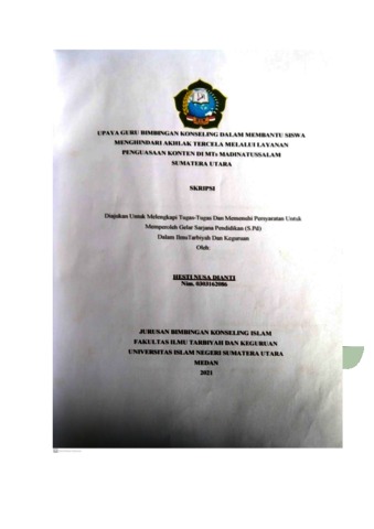 Dianti, Hesti Nusa (2021) Upaya Guru BK dalam membantu Siswa menghindari Akhlak Tercela Melalui Layanan Penguasaan Konten di MTs Madinatussalam Sumatera Utara. Skripsi thesis, Universitas Islam Negeri Sumatera Utara.