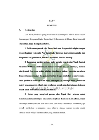 Perguruan-perguruan pencak silat pada umumnya memiliki ragam teknik beladiri, nilai ajaran dan falsafah yang begitu arif dan bijak peninggalan nenek moyang. Begitulah yang diterima pula oleh para pelatih pencak silat di pesantren Al-Husna Marendal. Mereka masih memegang teguh teknik beladiri, nilai ajaran dan falsafah khas dari pendiri perguruan tersebut dalam kehidupan sehari-hari, baik dalam pertandingan maupun hubungan sosial kemasyarakatan. Rumusan masalah dalam penulisan skripsi ini terdiri dari tiga persoalan yaitu: Bagaimanakah penyelenggaraan Pencak Silat Tapak Suci di Pesantren Al- Husna; Bagaimanakah upaya penanaman kematangan beragama bagi kader pencak silat tapak suci di Pesantren Al-Husna Dan Bagaimanakah Kematangan Beragama Kader yang mengikuti Pencak Silat Tapak Suci Di Pesantren Al- Husna? Metode yang digunakan dalam penulisan skripsi ini menggunakan penelitian lapangan yang bersifat kualitatif. Pendekatan kualitatif ini diharapkan mampu menghasilkan informasi dan mengambarkan keadaan objek penelitian pada saat peneliti ini dilakukan berdasarkan fakta Hasil dari penelitian dapat disimpulkan bahwa pertama, Pelaksanaan pencak silat Tapak Suci sarat dengan nilai religius dengan prosesi kegiatan yaitu salat Asar berjemaah, membaca dua kalimat syahadat dan doa pembukaan, pemanasan, istirahat, materi inti, dan doa penutup, Kader yang mengikuti pencak silat Tapak Suci terbiasa untuk menerapkan karakter religius terutama kedisiplinan dalam salat jemaahnya, sopan santunnya terhadap Bapak atau Ibu Guru, dan sikap amanahnya, meskipun juga pernah melakukan pelanggaran yang sifatnya ringan, namun mereka mulai terbiasa untuk belajar dari kesalahan yang telah dilakukan. Penanaman karakter religius kader melalui pencak silat Tapak Suci di Pesantren Al-Husna dilaksanakan melalui beberapa hal. Di antaranya, melalui salat jemaah Asar tepat waktu sebelum dimulainya latihan, kemudian membaca doa pembukaan maupun doa penutup latihan dengan dilafalkan secara bersama-sama, pemberian motivasi Islami untuk meningkatkan semangat kader, pemberian materi keagamaan (Al-Islam), dan pemberian contoh atau keteladanan dari para pelatih untuk berbuat baik dimana pun berada.