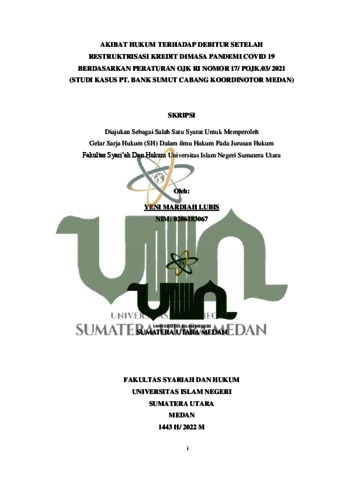 Lubis, Yeni Mardiah (2022) Akibat hukum terhadap debitur setelah restruktrisasi kredit dimasa Pandemi Covid-19 berdasarkan Peraturan OJK RI Nomor 17/POJK.03/ 2021 (Studi Kasus PT.Bank Sumut Cabang Koordinotor Medan). Skripsi thesis, Universitas Islam Negeri Sumatera Utara.