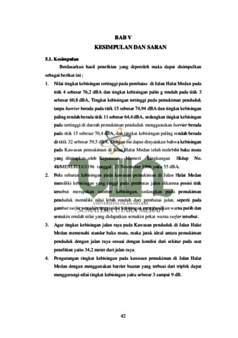 Penelitian ini bertujuan (i) untuk mengetahui tingkat kebisingan pada kawasan pemukiman di Jalan Halat Medan, (ii) Untuk mengetahui pola sebaran kebisingan, (iii) Untuk mengetahui jarak ideal dari Kawasan pemukiman di Jalan Halat Medan, (iv) Untuk mengetahui pengurangan tingkat kebisingan jalan raya menggunakan barrier. Penelitian ini dilakukan untuk mengukur tingkat kebisingan jalan raya pada Kawasan pemukiman di Jalan Halat Medan. Dalam penelitian ini jumlah titik ukur sebanyak 32 titik yaitu 8 titik pada Pembatas Jalan dan 24 titik pada pemukiman penduduk dengan jarak titik ukur 3 meter. Sumber bunyi berasal dari suara yang ditimbulkan dari jalan raya. Penelitian ini menggunakan barrier buatan dengan bahan triplek yang bertujuan untuk mencegah atau menghalangi transmisi dari sumber kebisingan di daerah sekitar pemukiman.Alat ukur yang digunakan untuk mengukur tingkat kebisingan adalah Sound Level Meter tipe TL 200. Pengolahan data penelitian menggunakan Software Surfer Golden untuk membuat peta kontur 2D dan 3D. tingkat kebisingan pada kawasan pemukiman di Jalan Halat Medan masih melebihi baku mutu yang ditetapkan oleh Keputusan Menteri Negara Lingkungan Hidup RI Nomor : Kep-48/MENLH/11/1996 untuk kebisingan pemukiman yaitu maksimal 55 dBA. Hasil penelitian diketahui tingkat kebisingan tertinggi sebesar 76,2 dBA dan tingkat kebisingan terendah sebesar 59,5 dBA. Kebisingan pada Kawasan pemukiman di Jalan Halat Medan telah melebihi standar baku mutu 55 dBA maka diperoleh jarak ideal adalah 34,2 meter dari jalan raya.