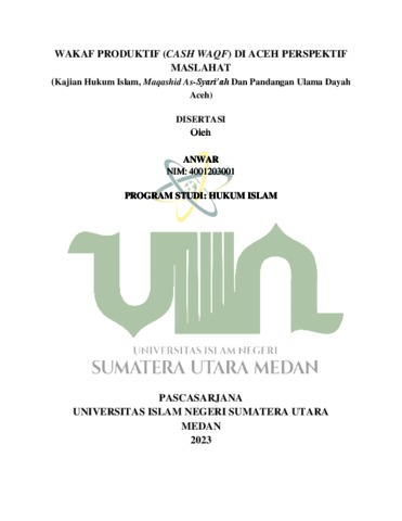 Anwar, Anwar (2023) Wakaf Produktif (Cash Waqf) Di Aceh Perspektif Maslahat (Kajian Hukum Islam, Maqashid As-Syari’ah Dan Pandangan Ulama Dayah Aceh). Doctoral thesis, Pascasarjana Universitas Islam Negeri Sumatera Utara.