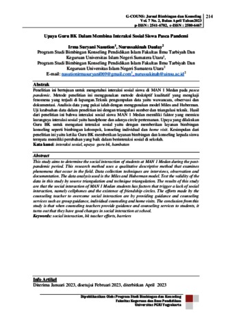 Penelitian ini bertujuan untuk mengetahui interaksi sosial siswa di MAN 1 Medan pada pasca pandemic. Metode penelitian ini menggunakan metode deskriptif kualitatif yang mengkaji fenomena yang terjadi di lapangan.Teknik pengumpulan data yaitu wawancara, observasi dan dokumentasi. Analisis data yang pakai ialah dengan menggunakan model Miles and Huberman. Uji keabsahan data dalam penelitian ini dengan triangulasi sumber dan triangulasi teknik. Hasil dari penelitian ini bahwa interaksi sosial siswa MAN 1 Medan memiliki faktor yang memicu kurangnya interaksi sosial yaitu handphone dan adanya circle pertemanan. Upaya yang dilakukan Guru BK untuk mengatasi interaksi sosial yaitu dengan memberikan layanan bimbingan konseling seperti bimbingan kelompok, konseling individual dan home visit. Kesimpulan dari penelitian ini yaitu ketika Guru BK memberikan layanan bimbingan dan konseling kepada siswa ternyata memiliki perubahan yang baik dalam berinteraksi sosial di sekolah.